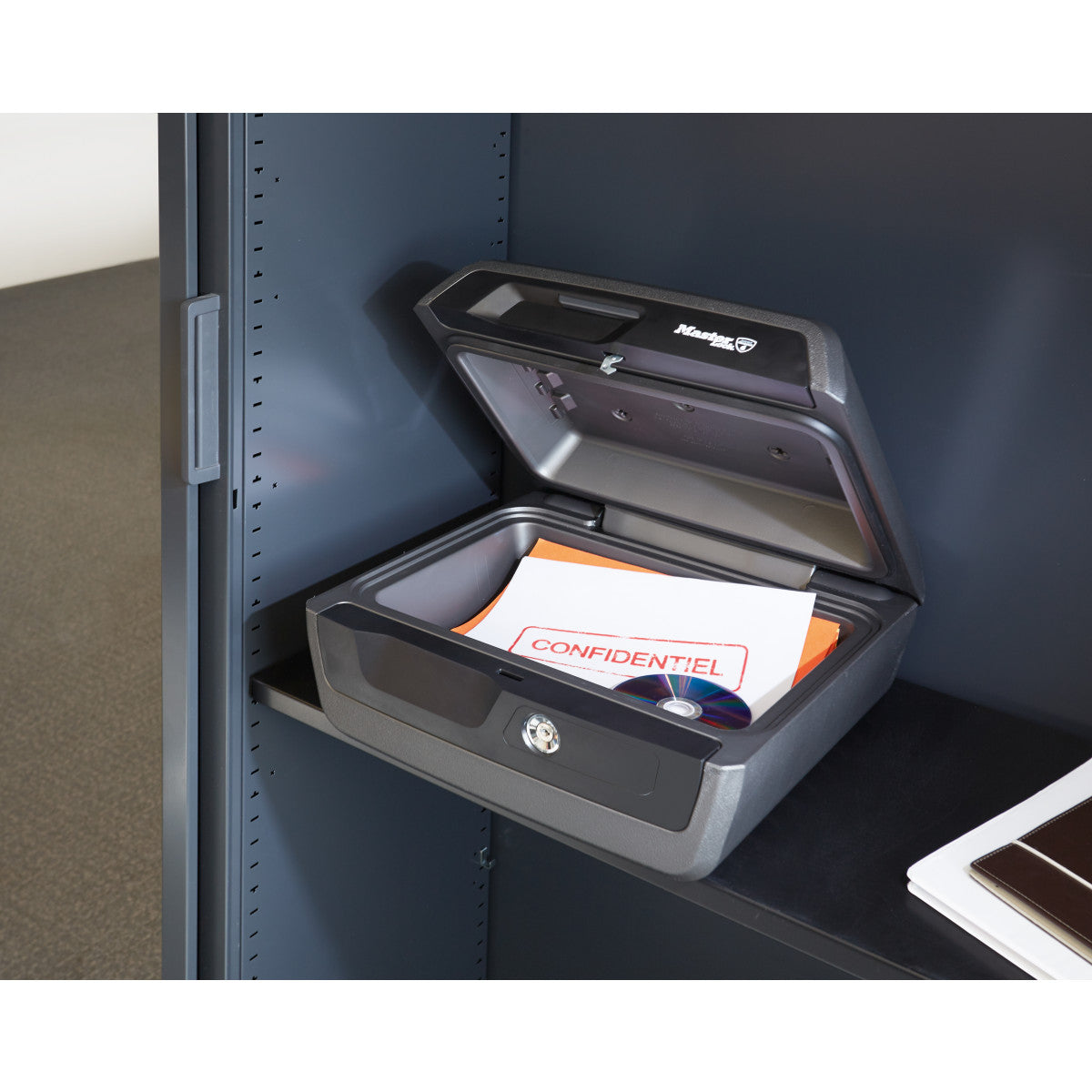 - La cerradura con llave de privacidad mantiene los documentos y objetos de valor alejados de miradas indiscretas y evita que la tapa se abra en caso de incendio