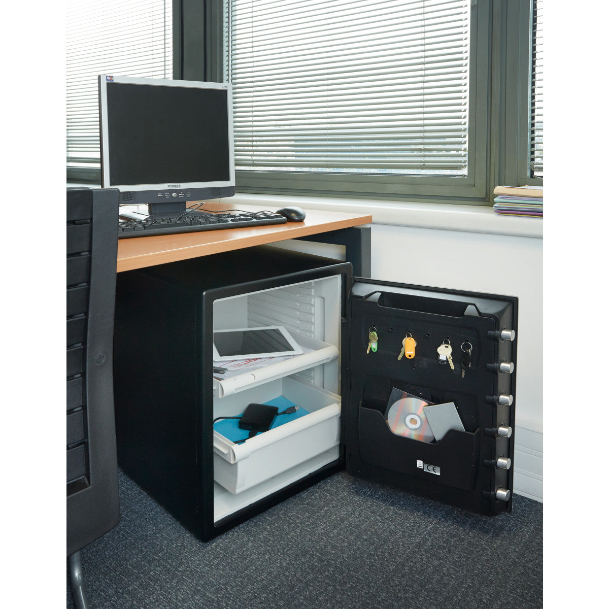 - Protección contra incendios de 60 minutos verificada por UL/ETL para documentos, papeles oficiales, así como artículos digitales (CD, memorias USB) hasta 927°C